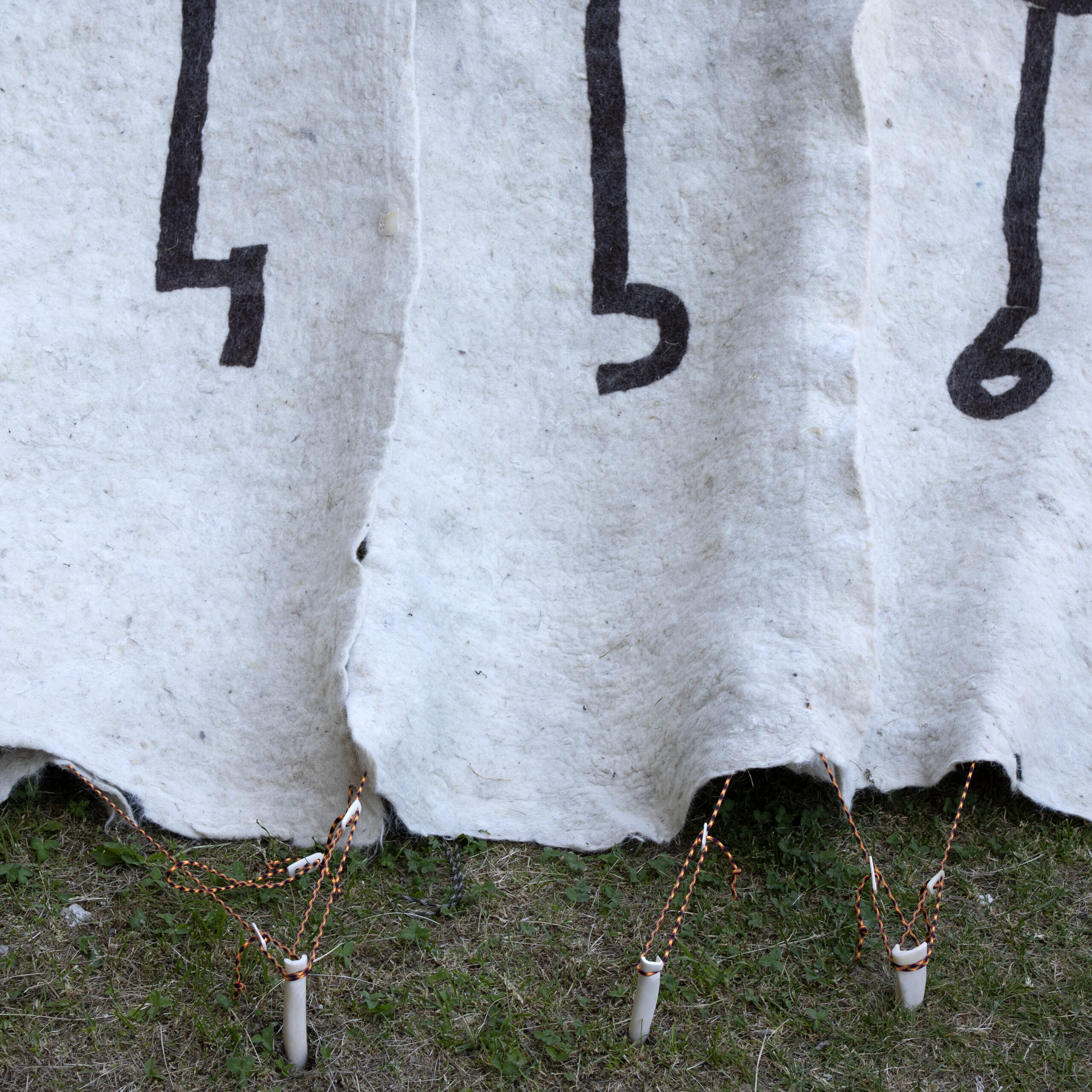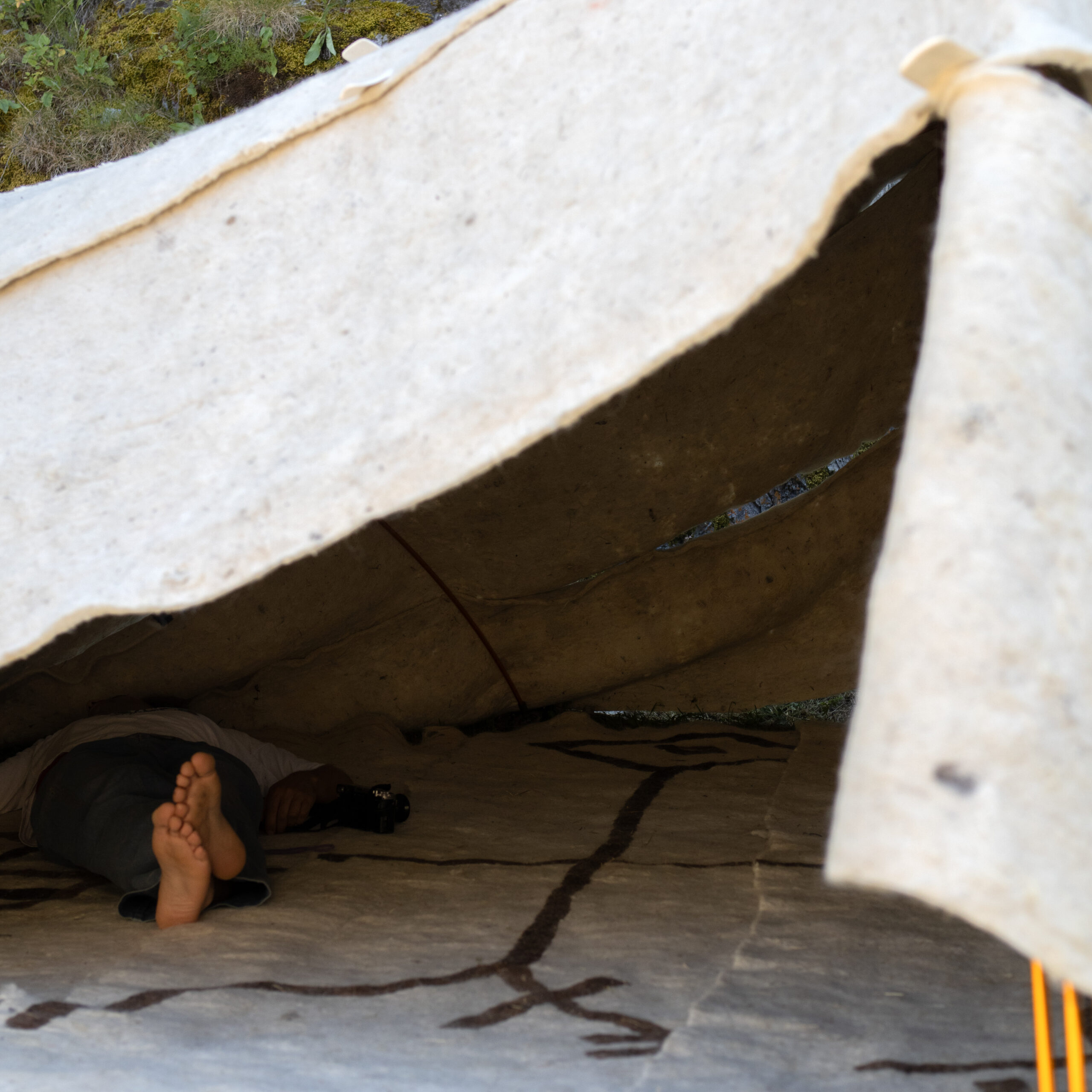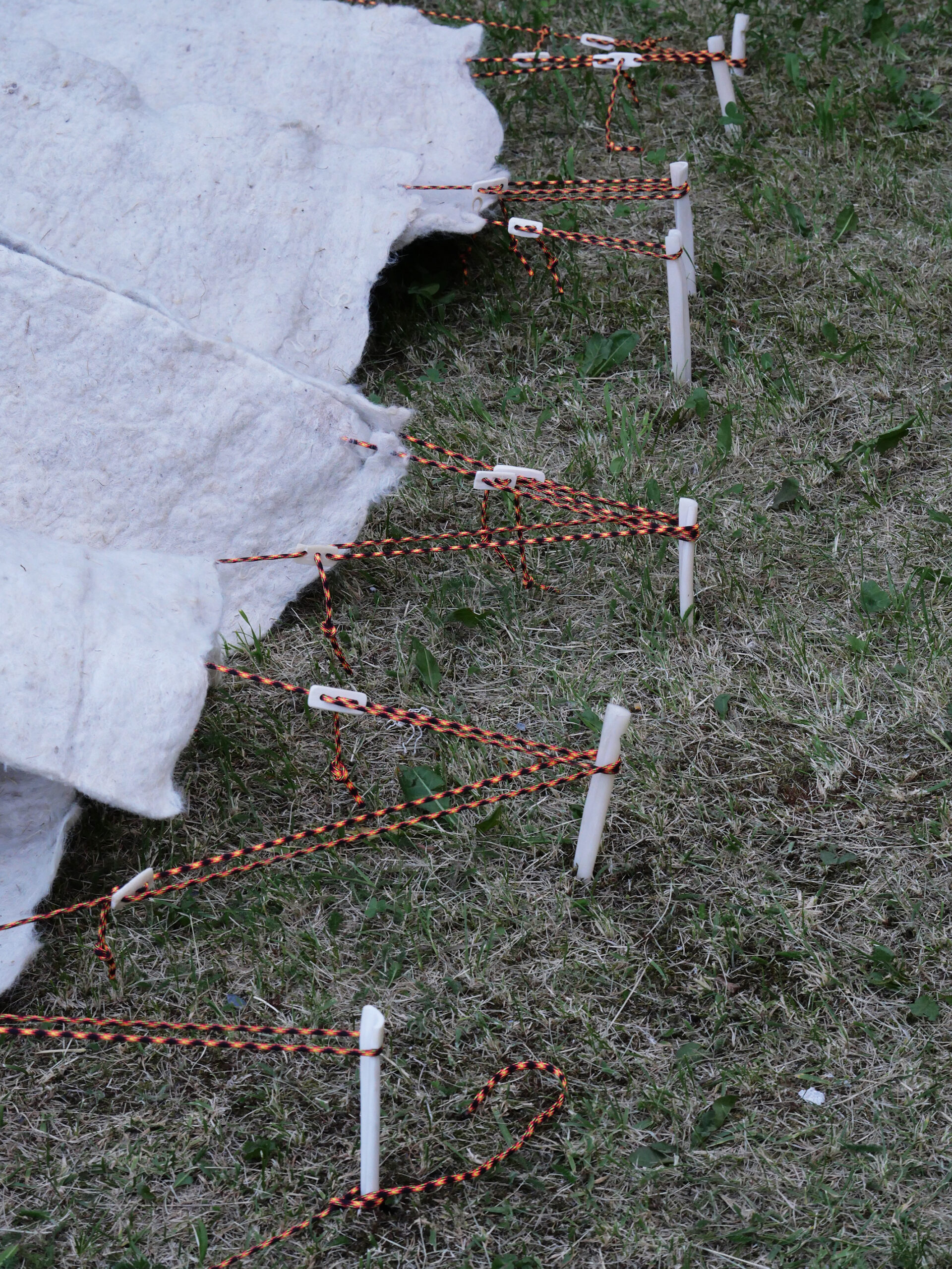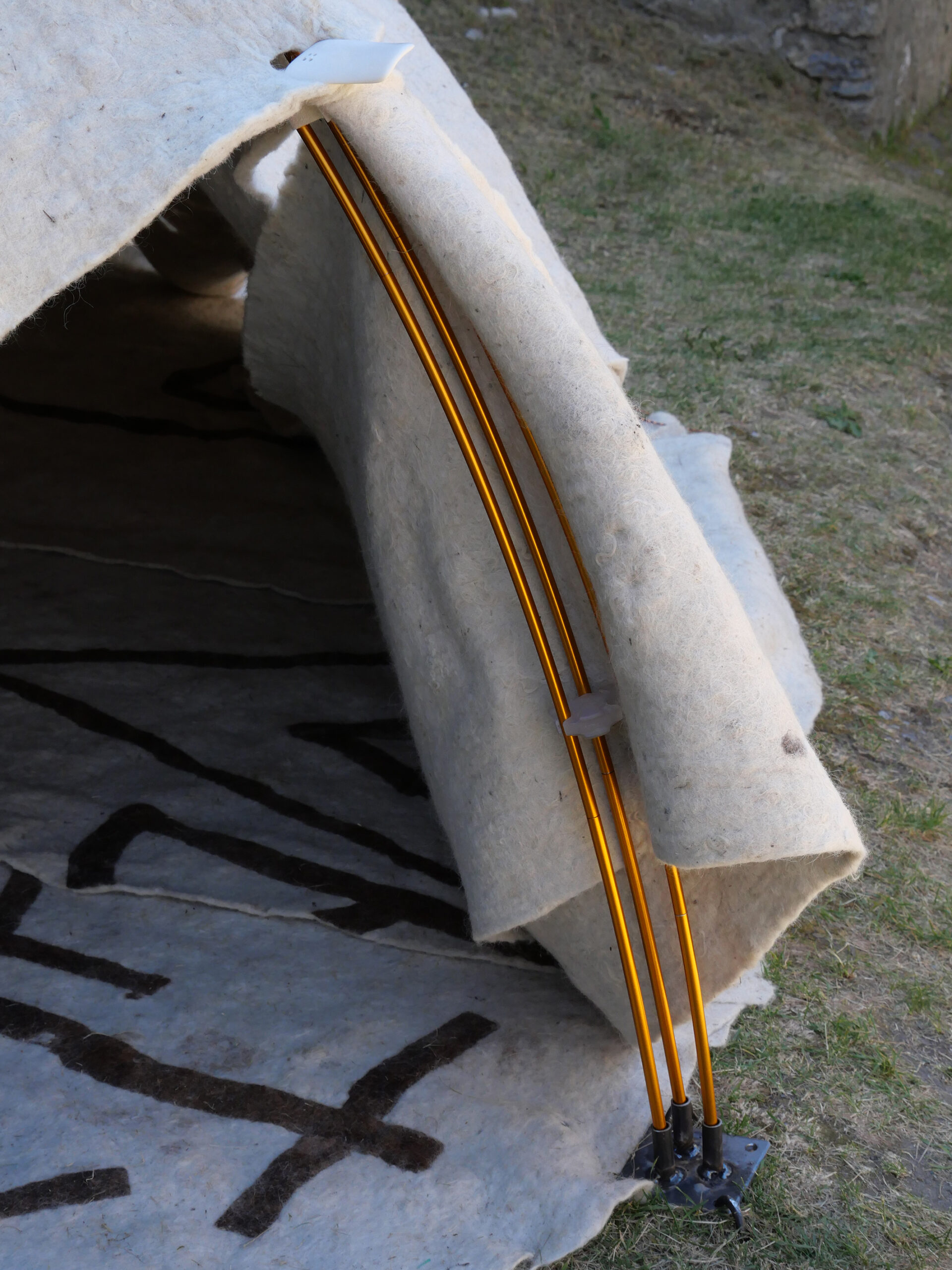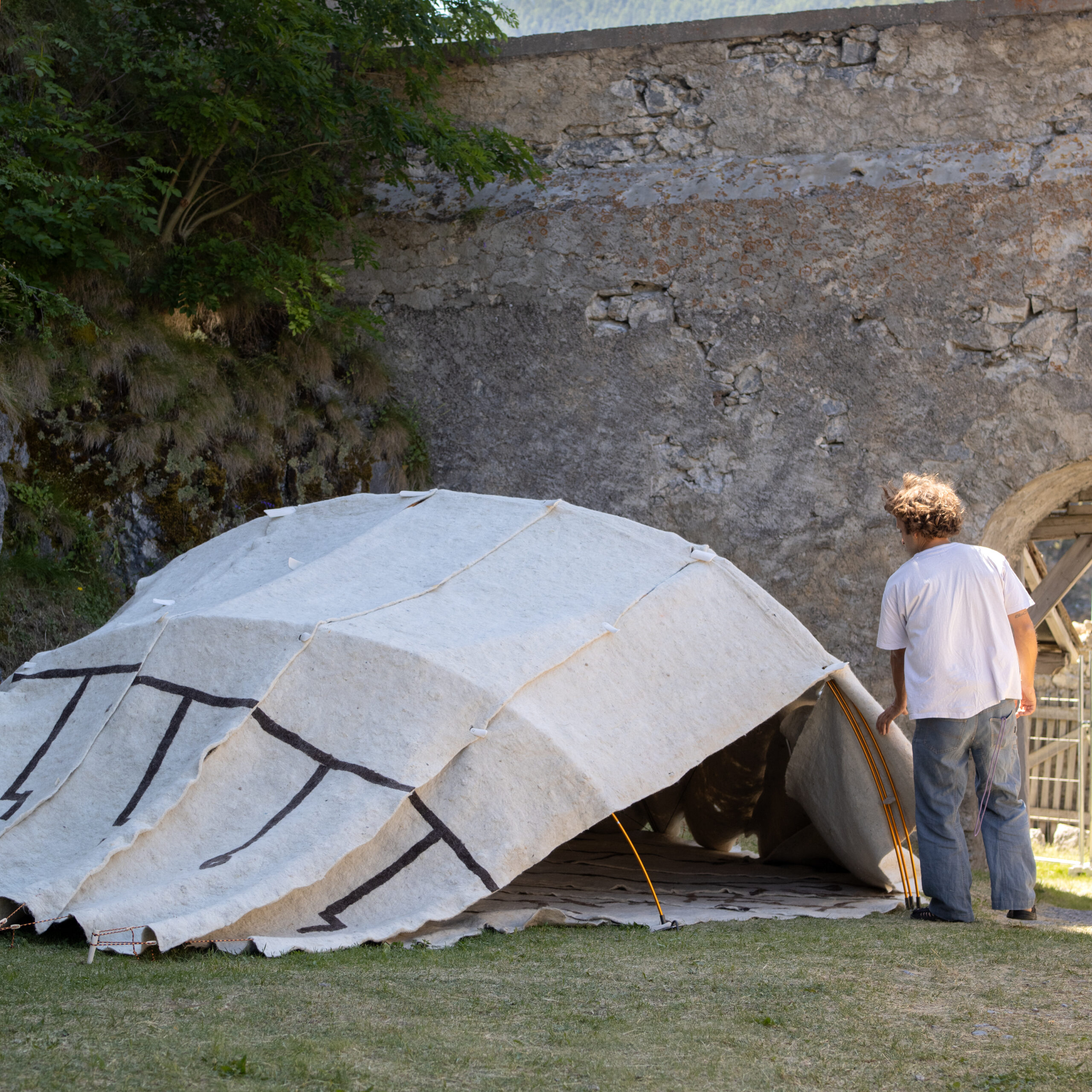 En partant de ces laines locales, Louis a crée huit longues laies de feutre constituant une coque protectrice et souple : une fois assemblées, elles deviennent un abri collectif marquant la halte d’une procession nomade.