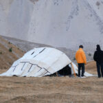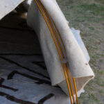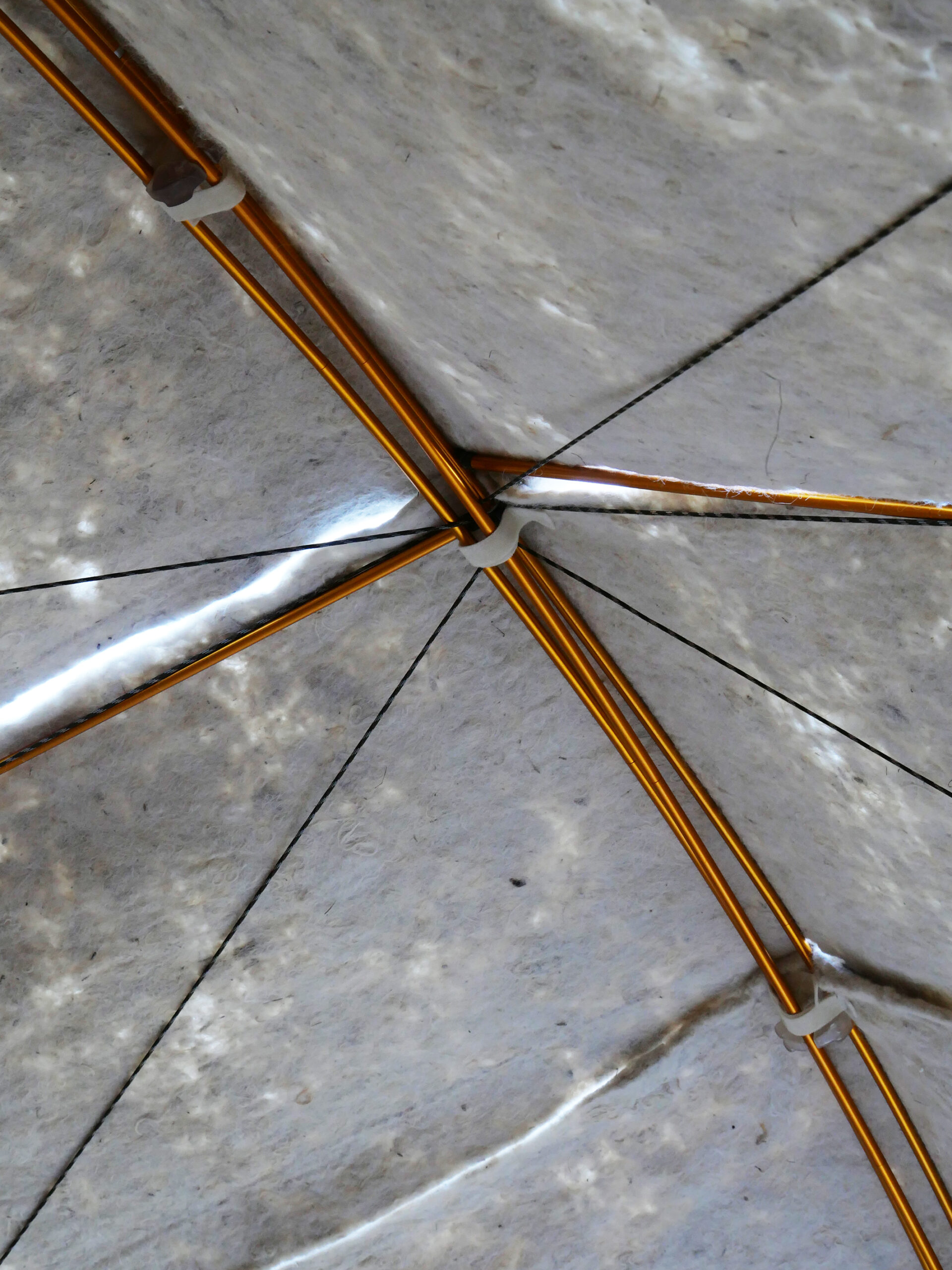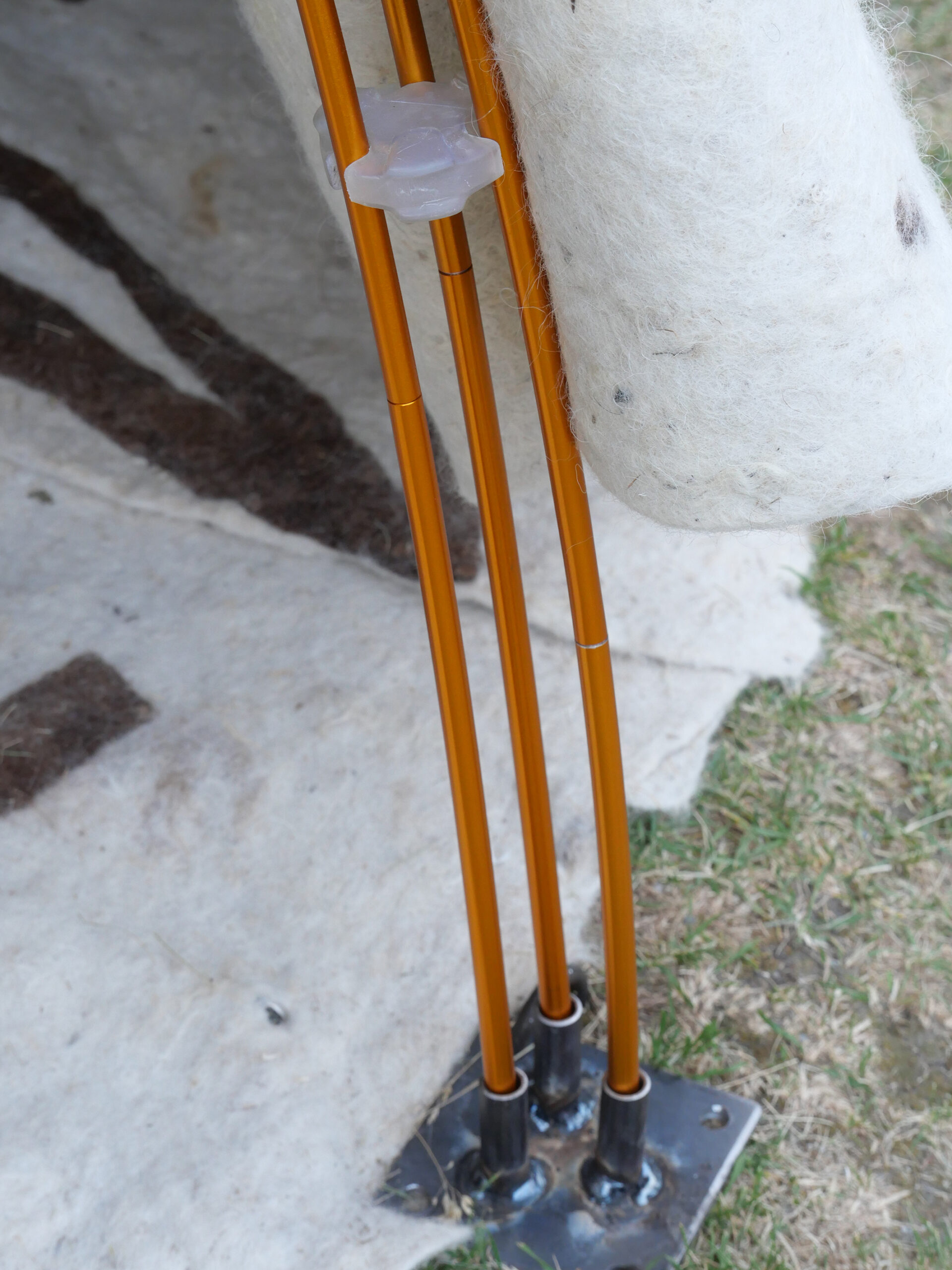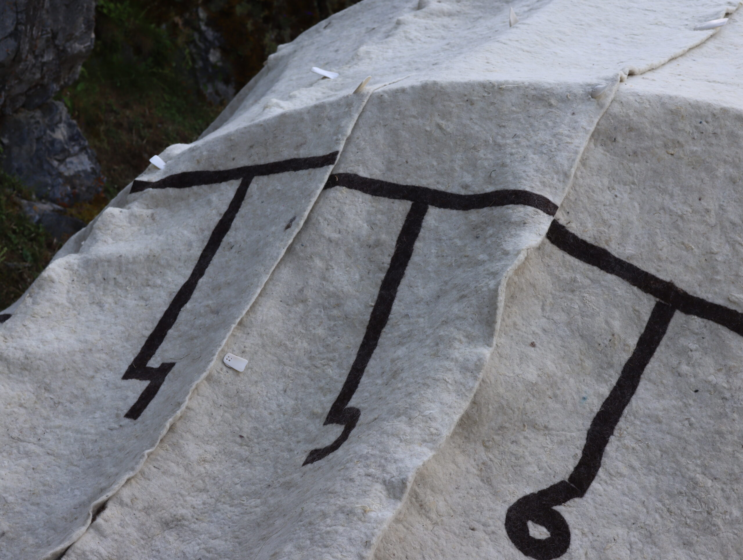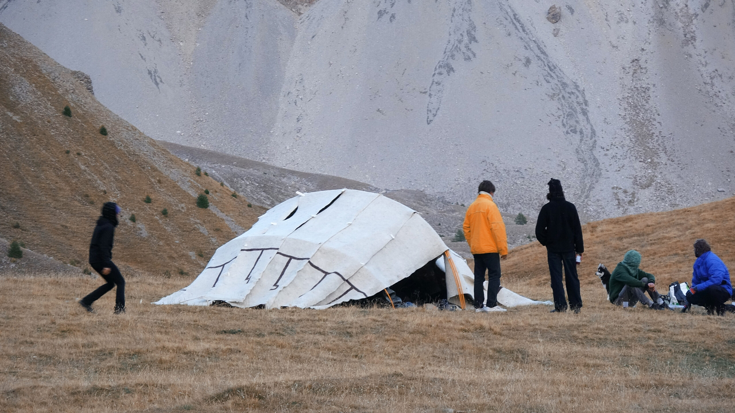 En partant de ces laines locales, Louis a crée huit longues laies de feutre constituant une coque protectrice et souple : une fois assemblées, elles deviennent un abri collectif marquant la halte d’une procession nomade.