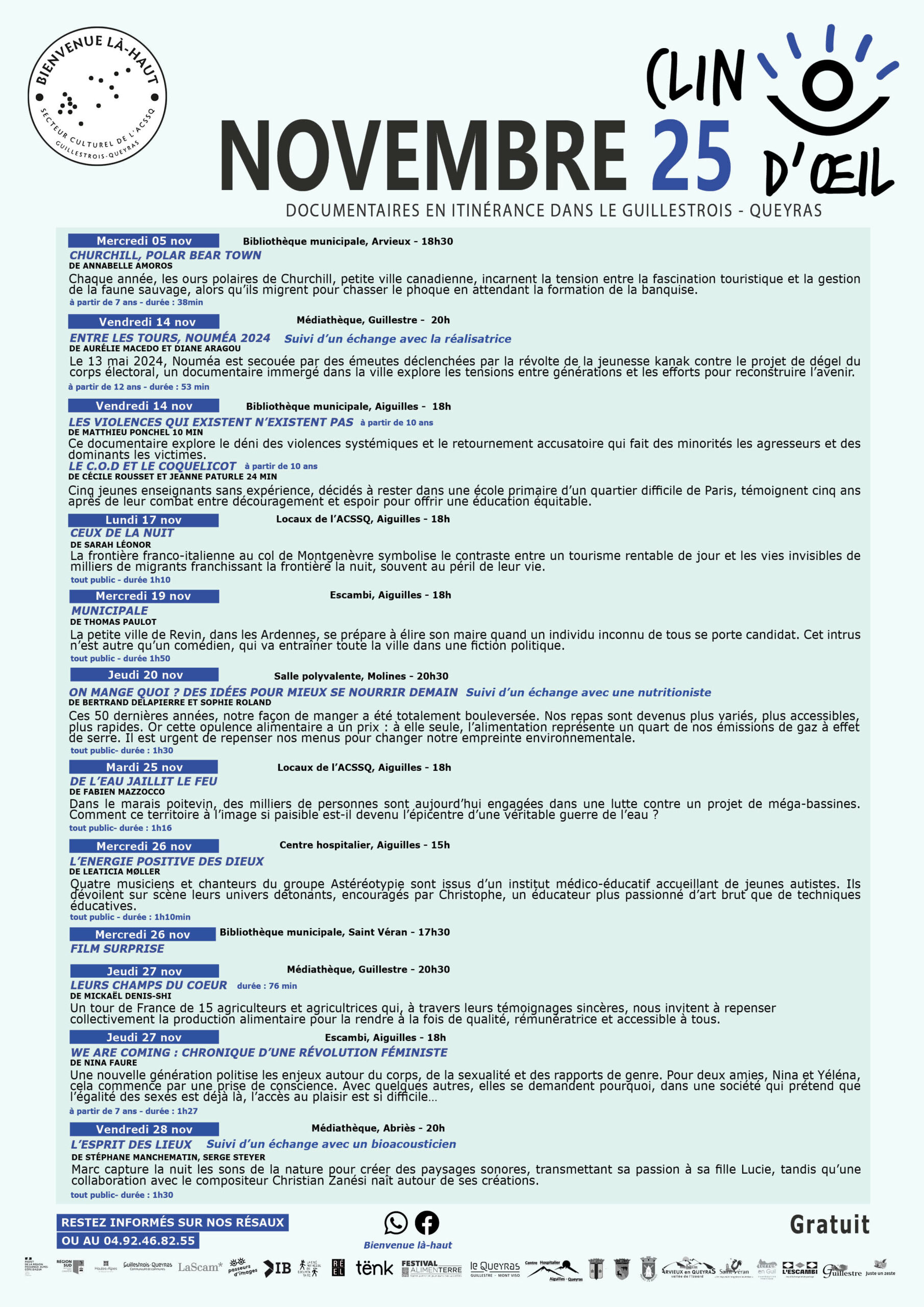 Novembre 25 – Clin d’œil | Mois du documentaire / Agenda, Non classé Le mois du film documentaire reprend en novembre dans le Guillestrois-Queyras. De nombreuses projections sont organisées en itinérance dans les villages du territoire ! Plus d’infos au 04.85.96.03.21