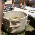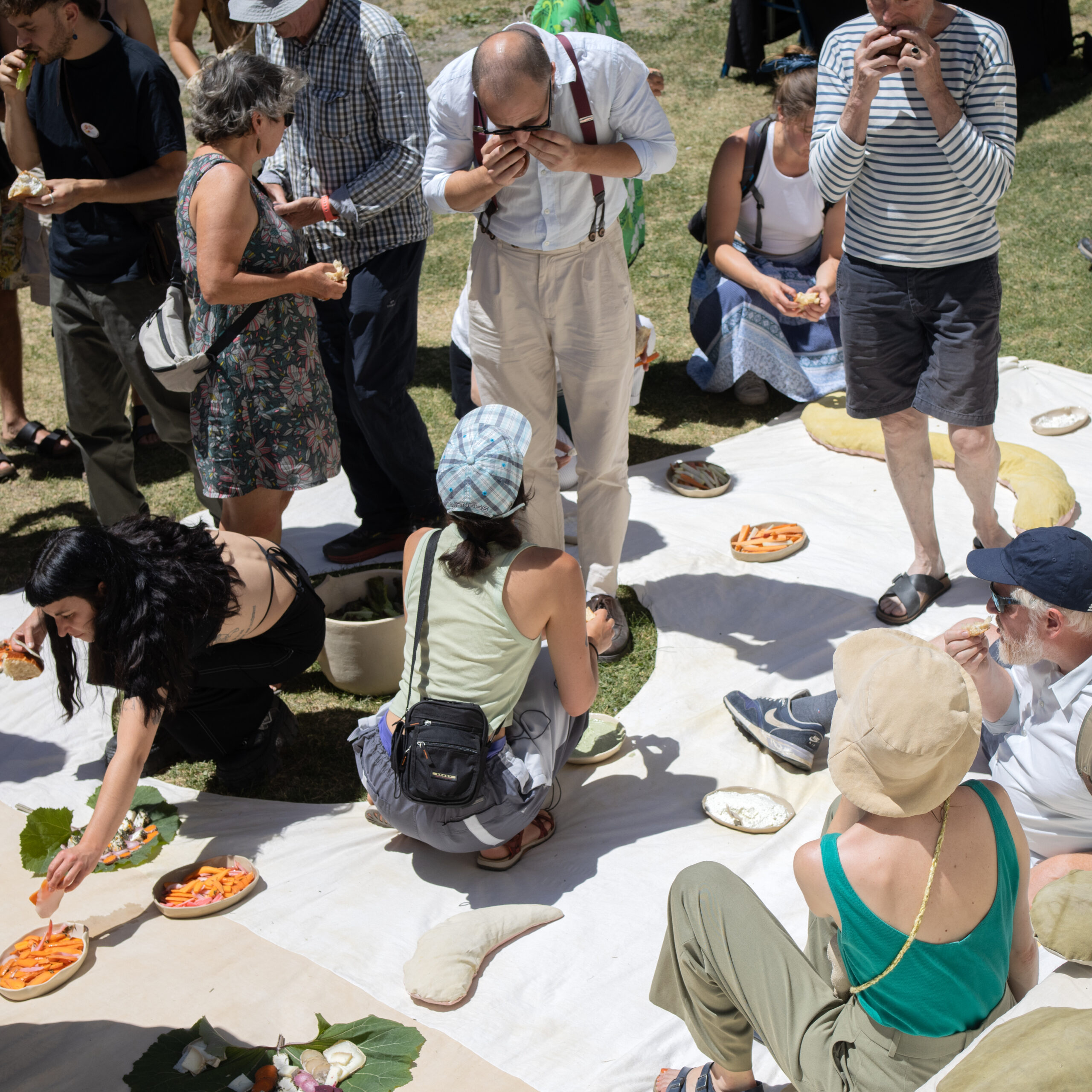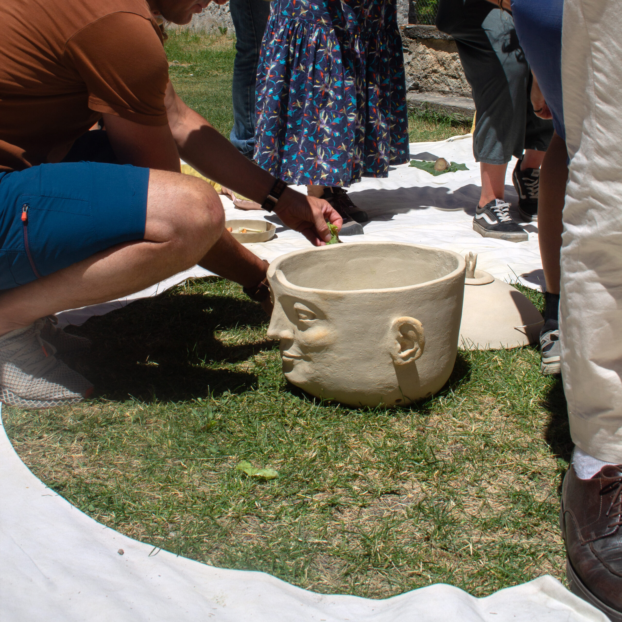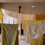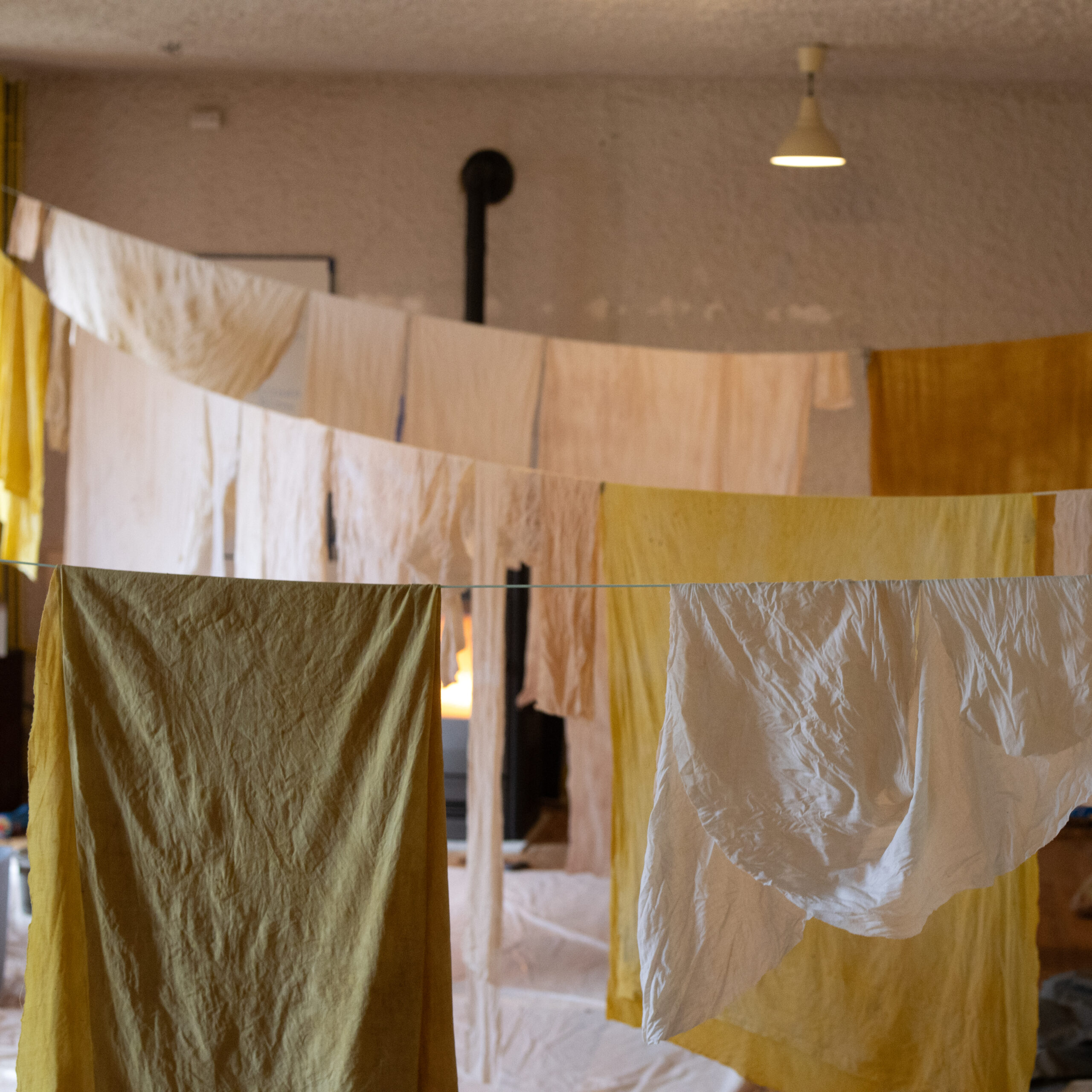 Les sculptures de Lucie, à la lisière de l’utilitaire, marquent l’accointance entre art et artisanat. Les matériaux utilisés sont récupérés, cueillis, colorés par des plantes, achetés d’occasion, redécouverts, cultivés, cuisinés. Il s’agit d’une écologie de travail, une contrainte formelle qui l’engage à faire avec ce qu’il y a ; elle adapte ses besoins et dresse ainsi un portrait des territoires où elle est invitée, des personnes avec lesquelles elle travaille.