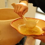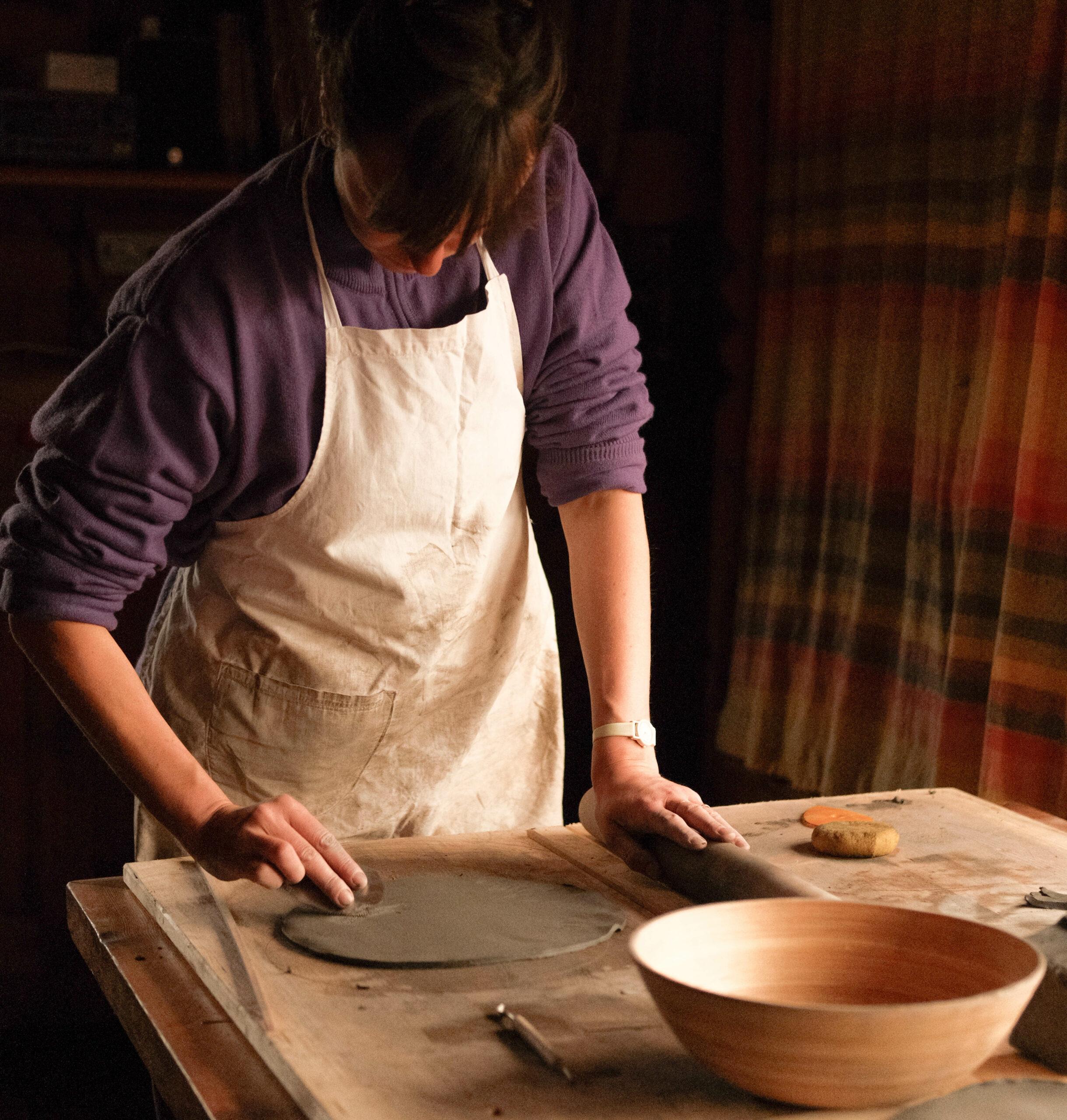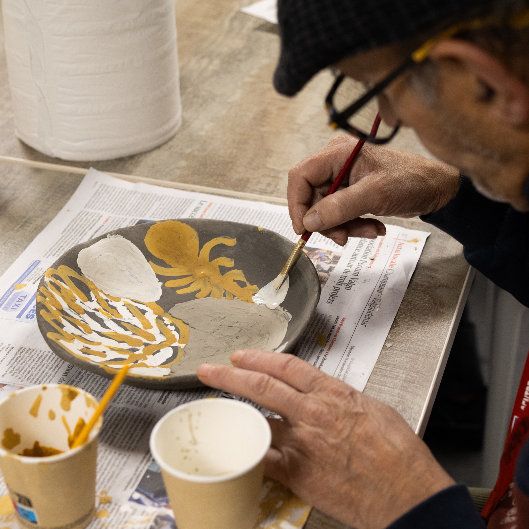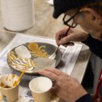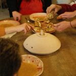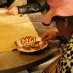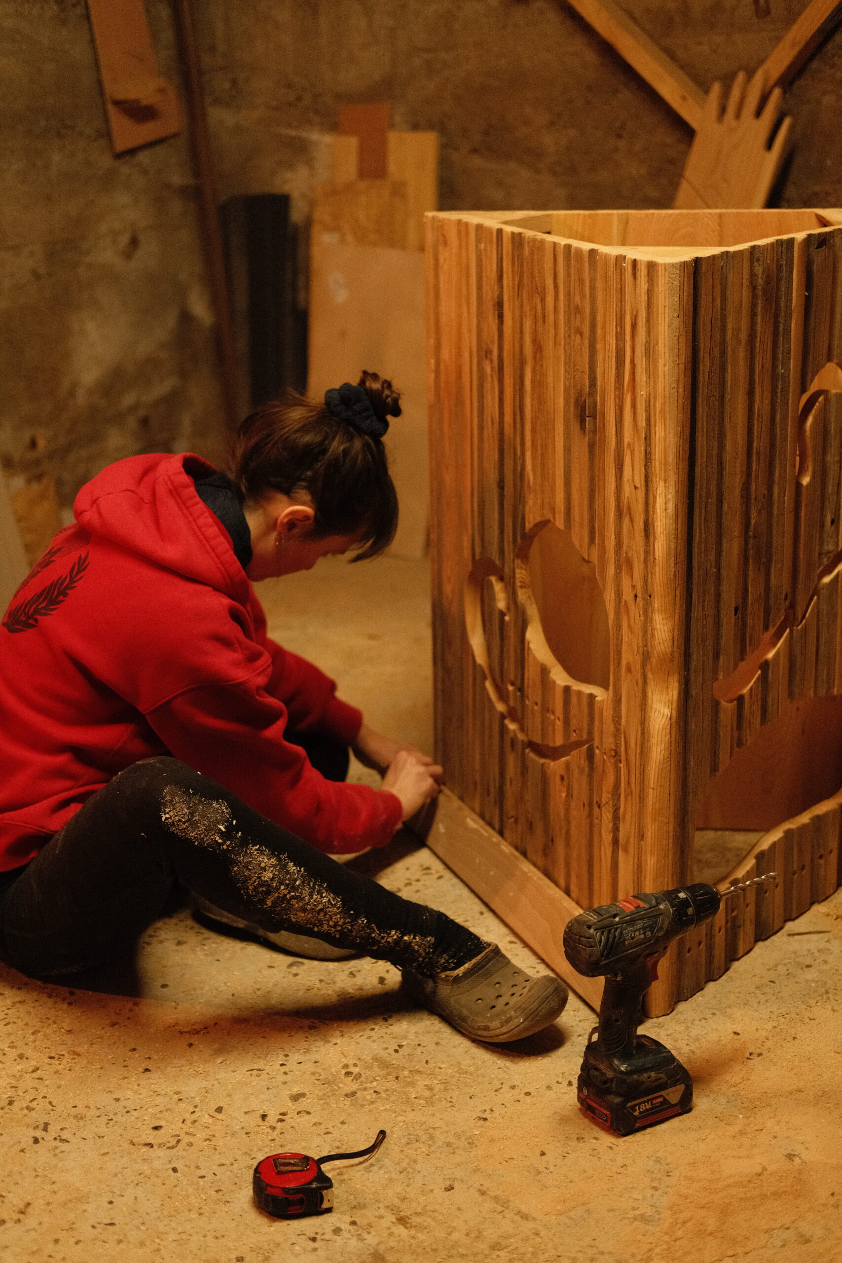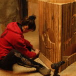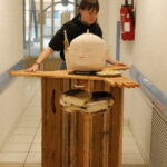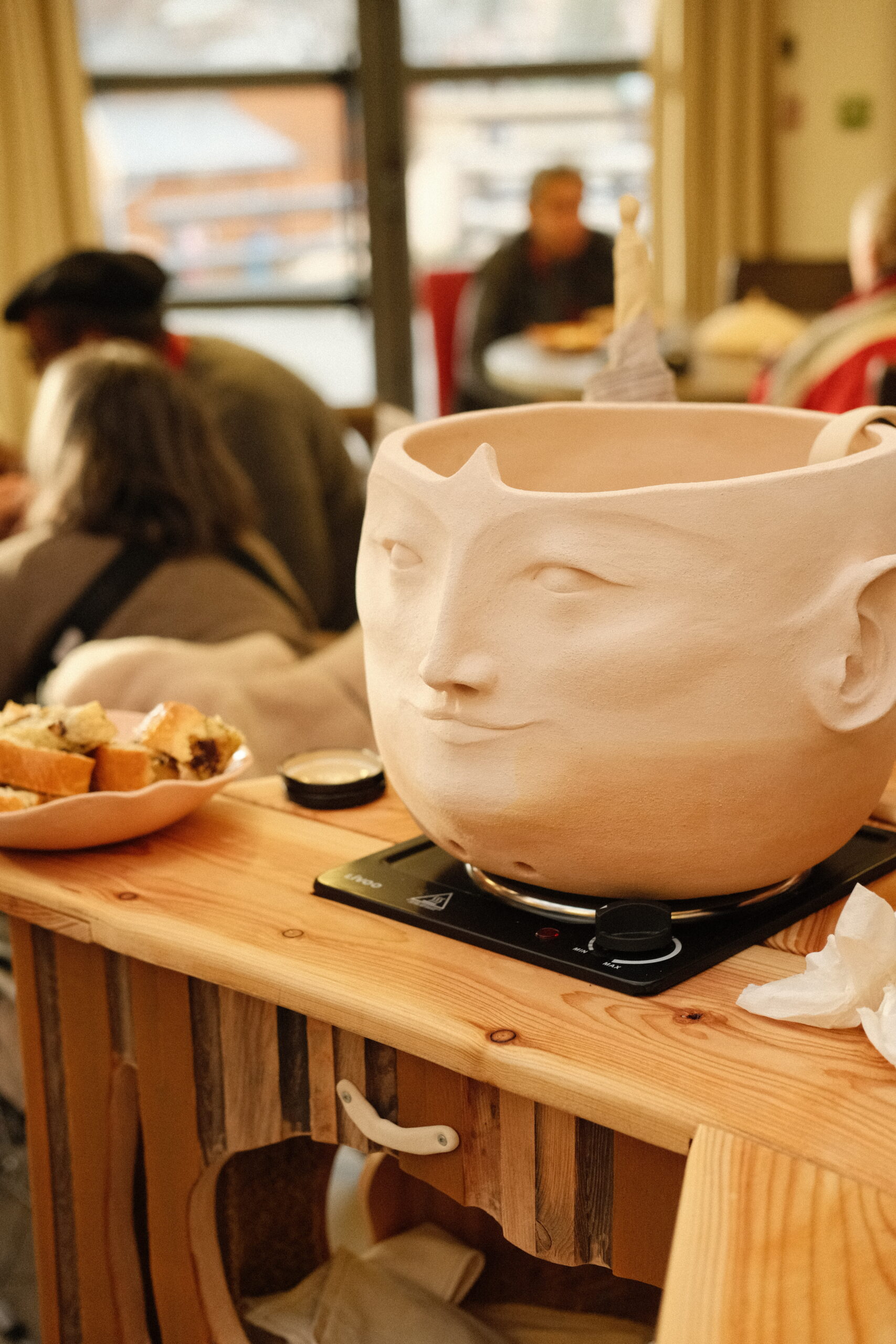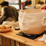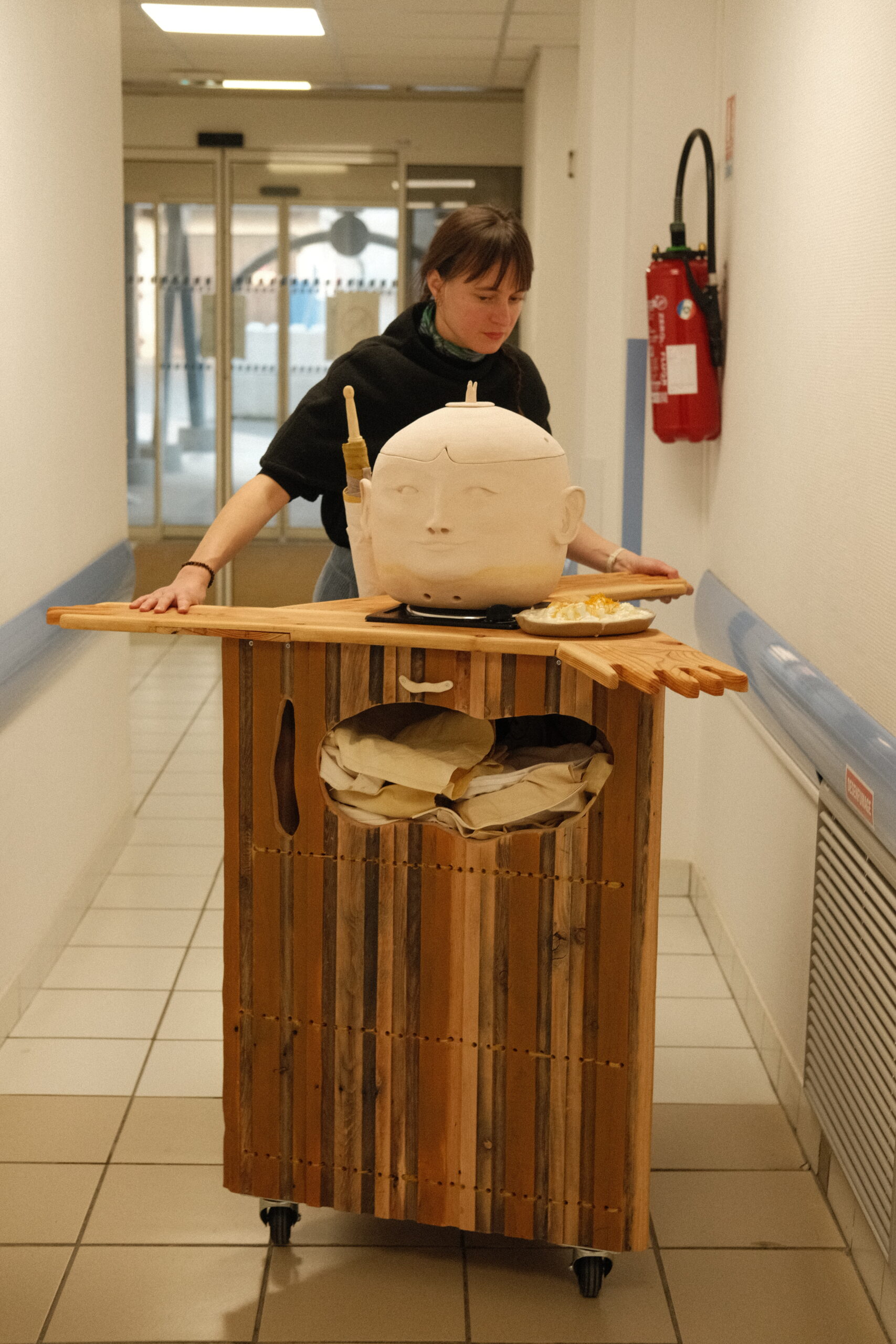 Pour le projet La Bulle, Lucie Malbéqui a conçu une cuisinière mobile aux allures anthropomorphes. Réalisé en bois et habillé de draps teints à partir de plantes locales, cet objet présente de multiples fonctionnalités.  L’artiste a également animé plusieurs ateliers de céramique, permettant aux résident·es de créer leurs propres assiettes, destinées à être utilisées lors des repas rendus possibles par ce dispositif. Ce mobilier sur roulette a vocation à être utilisée lors de fêtes d’anniversaire ou d’événements spécifiques, organisés aussi bien au sein du centre qu’en extérieur.
